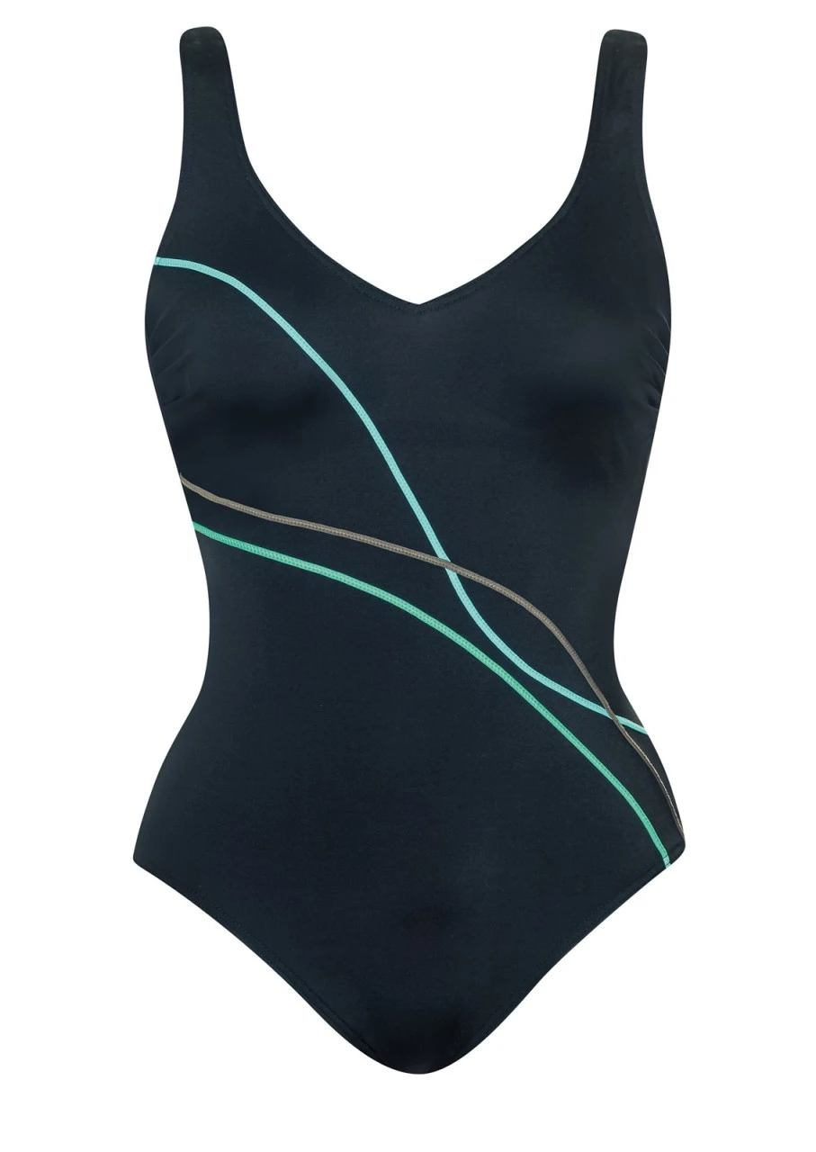 Probier´s doch mal klassisch! Elegantes Schwarz kombiniert mit feinen grünen Streichen auf der Vorderseite. Badeanzug mit Softschalen. Der Einteiler ist aus einem speziellen chlorresistenten Material gearbeitet, das selbst hoher Beanspruchung trotzt und der Trägerin lange Freude bereitet.