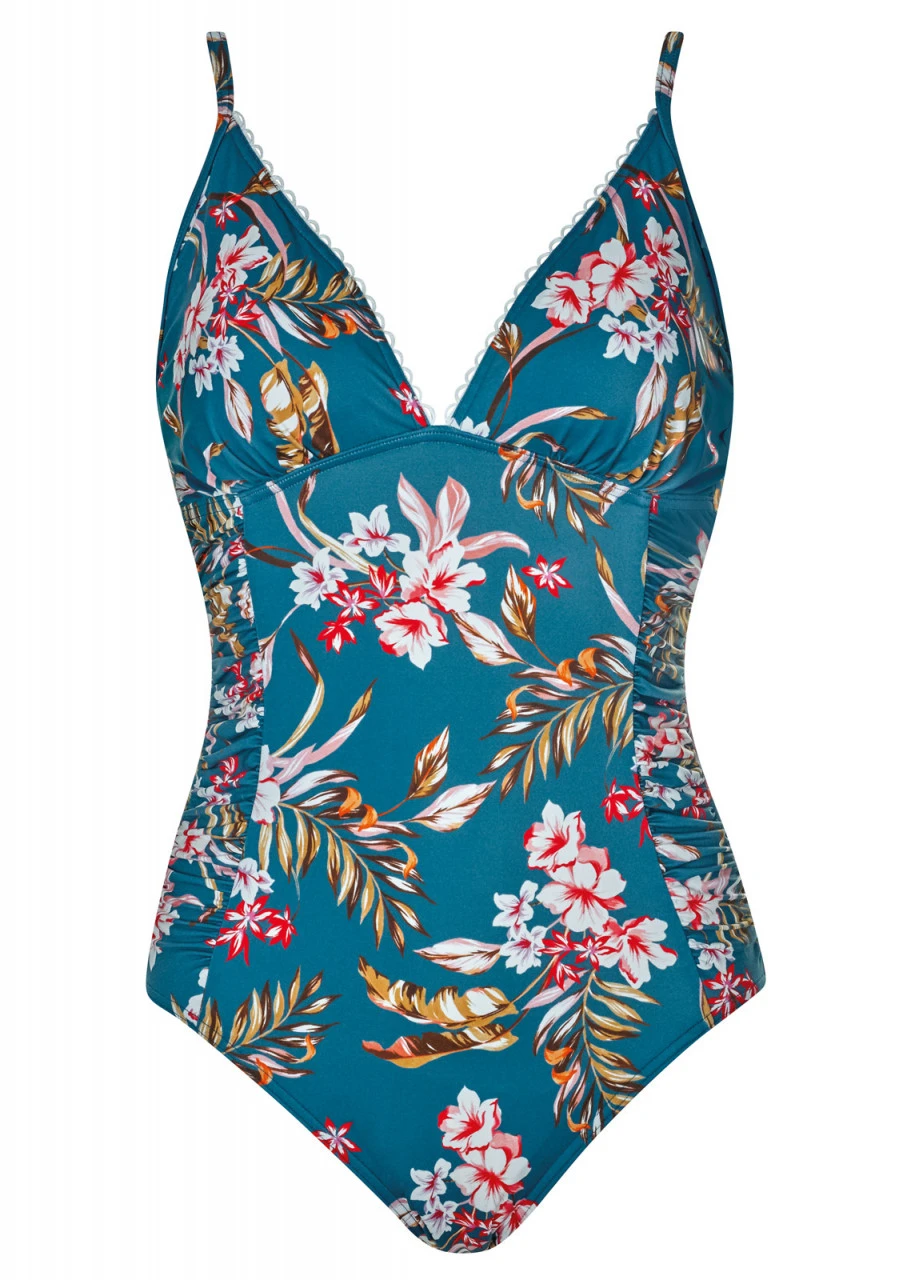 Herrliche Blüten und Palmblätter auf taubenblauem Grund. Jung, frisch und einfach wunderschön! Badeanzug mit Softschalen und verspielten Raffungen an den Seiten. Die Träger sind verstellbar und an der Rückseite aushakbar. Schönes Detail: Niedliche, weiße Borte am Dekolleté. Hoher Rückenausschnitt. Nachhaltige Bademode: OLYMPIA® GOES NEXT LEVEL – Bademode aus recyceltem Material.