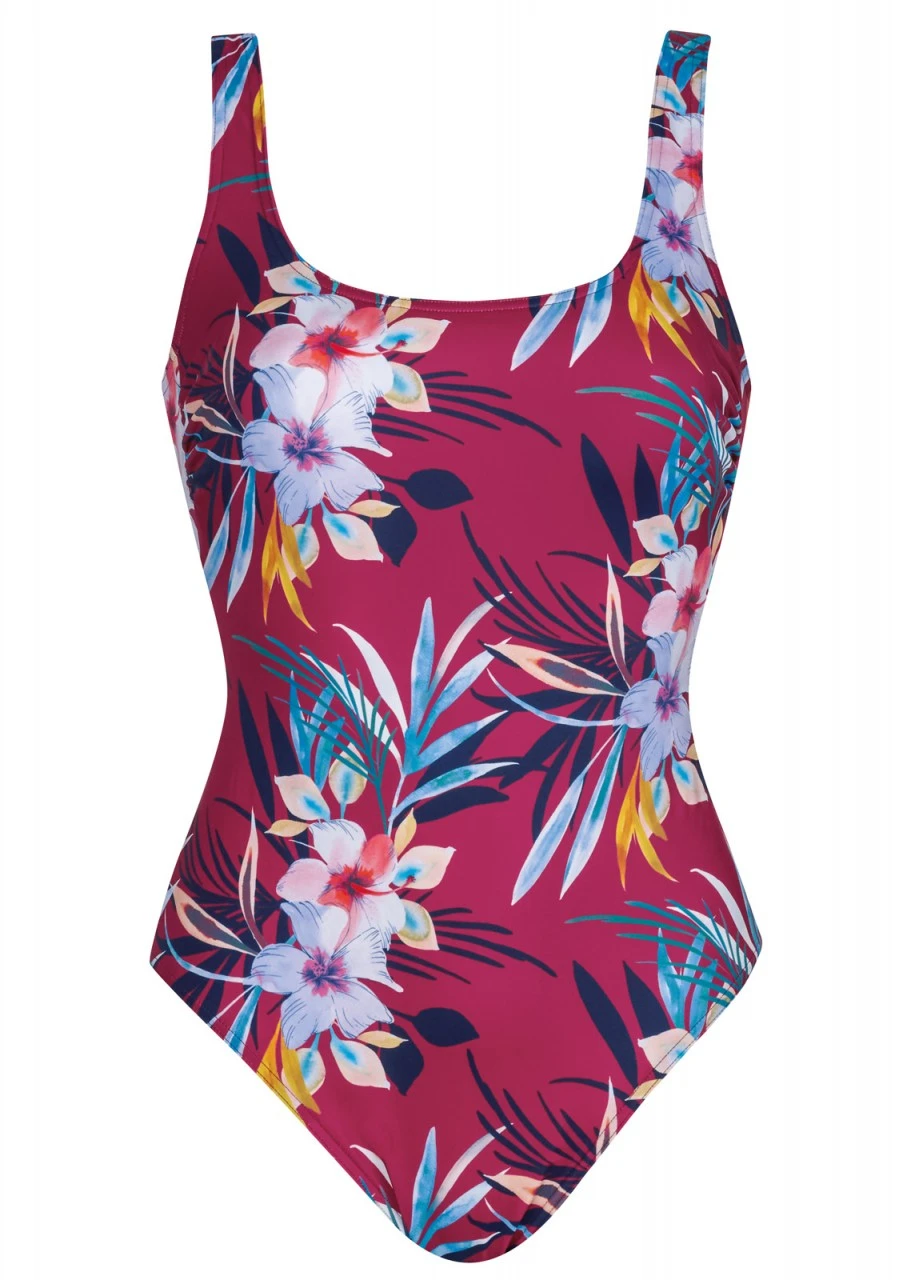 Urlaubsfeeling pur! Herrliche Hibiskusblüten und Blätter in Pastellfarben und Blau auf dunkelrotem Grund. Badeanzug mit Softschalen und einem tiefen Rückenausschnitt. Die Träger sind verstellbar. Nachhaltige Bademode: OLYMPIA® GOES NEXT LEVEL – Bademode aus recyceltem Material.