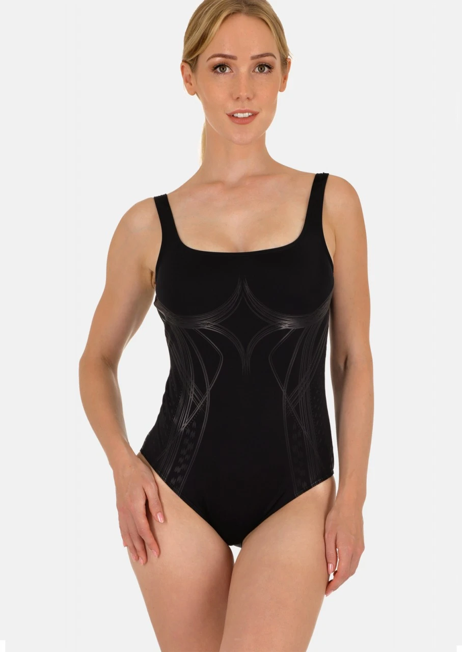 Punktgenaues Shaping! Badeanzug mit Futterstütze und einem tiefen Rückenausschnitt. Der sportive Print wird mittels der innovativen LYCRA®® FitSense™ Technologie auf den Stoff aufgedruckt. Damit entsteht eine völlig neue Art von optimal und zugleich komfortabel formender Bademode. Erhältlich in den Farben Schwarz und Grün. Nachhaltige Bademode: OLYMPIA® GOES NEXT LEVEL – Bademode aus recyceltem Material.