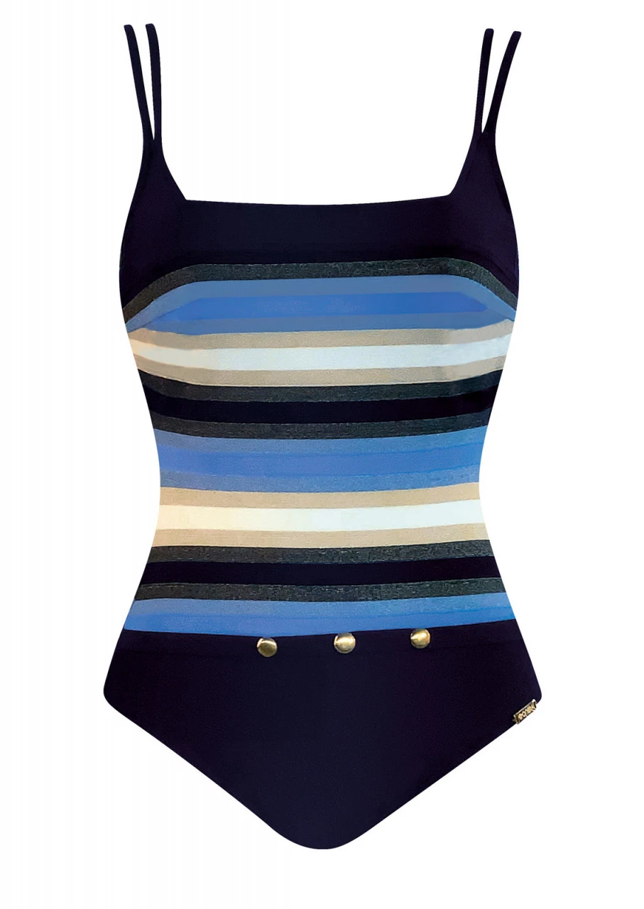 Die pure Verführung! Luxuriöses Streifendesign mit schönen Blautönen, Ecru und metallischem Glitzer-Effekt. Badeanzug mit Formbügel, geradem Ausschnitt und nachtblauen Abschlüssen. Die doppelten Träger sind verstellbar. Das Zierband in Gürteloptik mit goldfarbenen Zierteilen unterstreicht die Eleganz des Designs. Tiefer Rückenausschnitt. Der Badeanzug ist komplett mit Futter unterlegt.