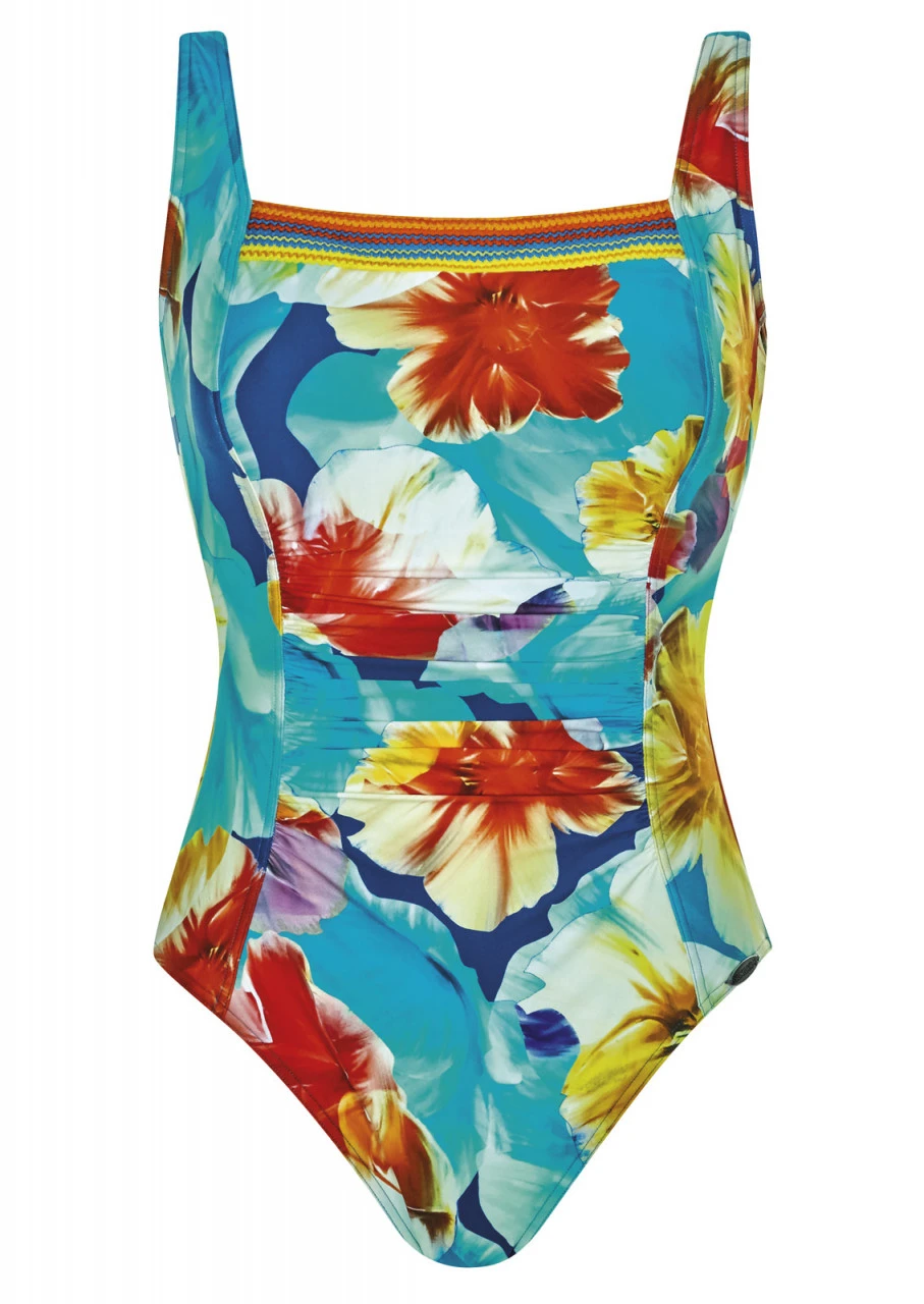 Wie ein Aquarell auf Ihrer Haut. Tolle Farben, dominiert von Türkis und sommerlichen Gelb und Orange. Blütendrucke in Aquarelloptik. Badeanzug mit Softschalen. Die Träger sind verstellbar und am Rücken zum Aushaken. Genial sind die figurschmeichelnden Raffungen an der Vorderseite. Tolles Detail: Gestreiftes, farbenfrohes Ziergummiband in Weboptik am geraden Ausschnitt. Der Einteiler ist komplett gefüttert. Durch diese Vollfütterung garantiert der Einteiler zusätzlichen Halt und ist besonders blickdicht. Hoher Rückenausschnitt.