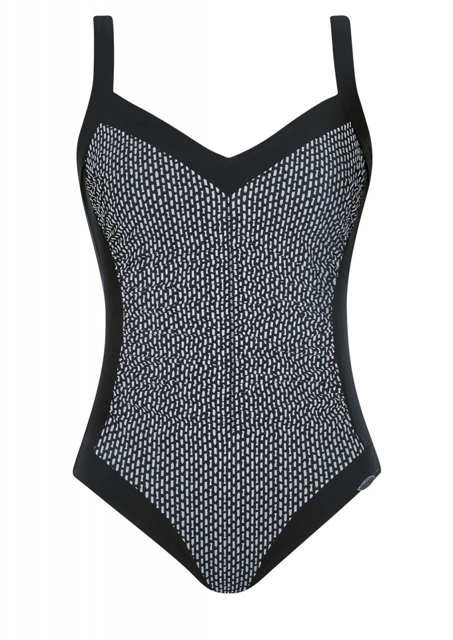 Wie von Hand gemalt: Kleines, feines Design in Schwarz/Weiß. Tiefschwarzer Untergrund, darauf senkrechte, kleine Striche in Weiß. Eine ganz besonders originelle Design-Idee. Badeanzug mit Softschalen. Die Träger sind verstellbar. Der Einteiler ist sozusagen schwarz eingerahmt, somit kommt das Design perfekt zur Geltung. Besonders trage- und figurfreundlich durch die leichten Raffungen an der Vorderseite. Die Rückseite des Einteilers ist in der Farbe Schwarz und hat einen tiefen Ausschnitt. Der Einteiler ist komplett gefüttert. Durch diese Vollfütterung garantiert der Einteiler zusätzlichen Halt und ist besonders blickdicht.