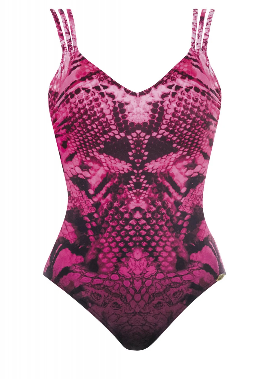 Shape-Badeanzug mit Softschalen aus einem besonders kräftigen, formenden Material. Unwiderstehlicher Print mit Farbverlauf von Pink nach Schwarz, darauf ein üppiger Ketten- und Animal-Print. Die dreifachen, feinen Träger sind verstellbar. Tiefer Rückenausschnitt.