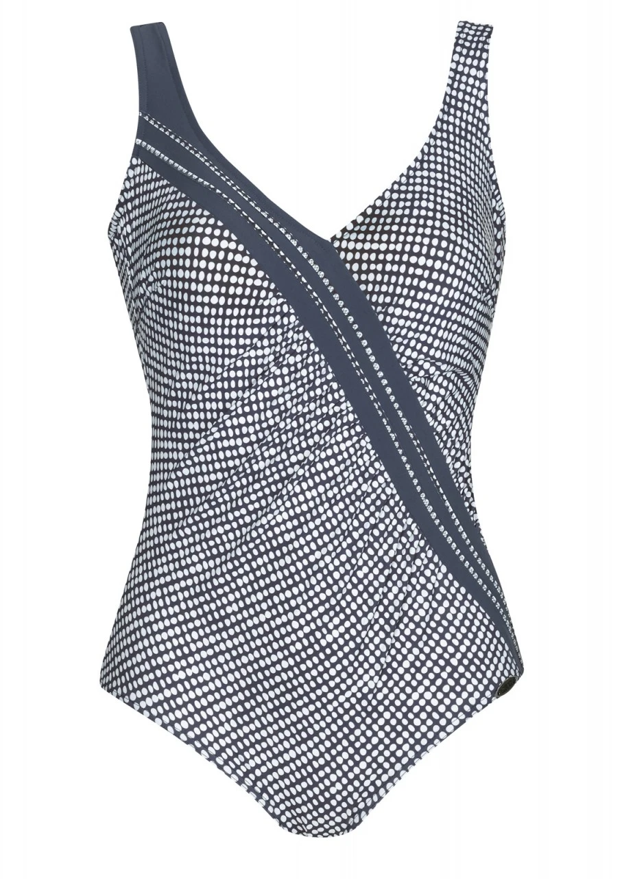 Wie kleine Kieselsteine reihen sich die weißen Ovale, auf dem grauem Hintergrund, aneinander. Ein traumhaft schönes Design. Badeanzug mit Softschalen, Halbcorsage und figurfreundlichen Raffungen an der Vorderseite. Die diagonalen Linien in Grau strecken optisch die Figur. Tiefer Rückenausschnitt.