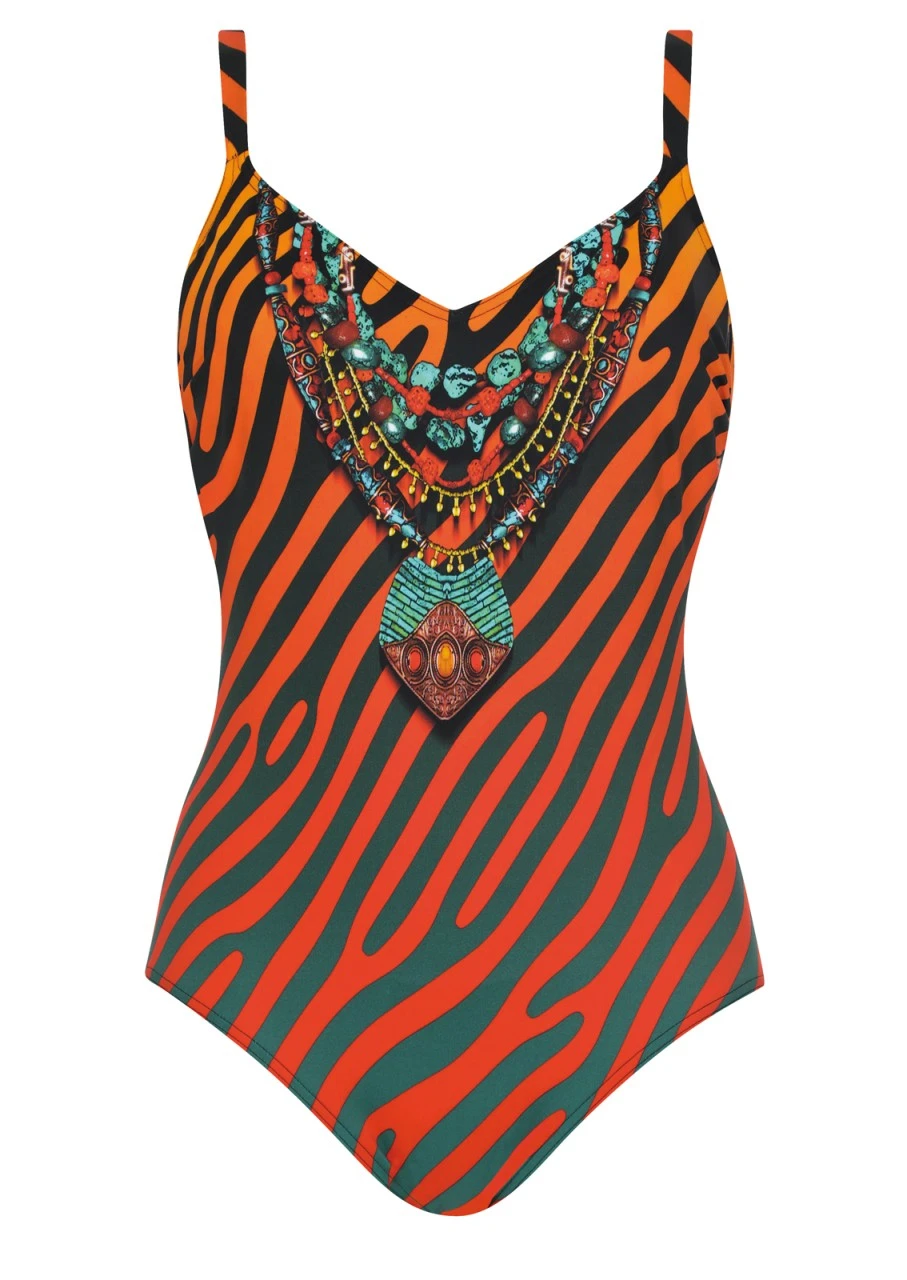 Shades of Orange! Unwiderstehlicher Print mit Farbverlauf und schwungvollen Diagonalstreifen, kombiniert mit einem üppigen Kettenprint im Ethno-Stil. Ein unvergleichliches Design in kräftigem Orange. Badeanzug mit Formbügel und einem tiefen Rückenausschnitt. Die Träger können passgenau in der Länge verstellt werden. Nachhaltige Bademode: Das Polyamid für den Oberstoff ist zu 100 % aus recycelten Fasern.