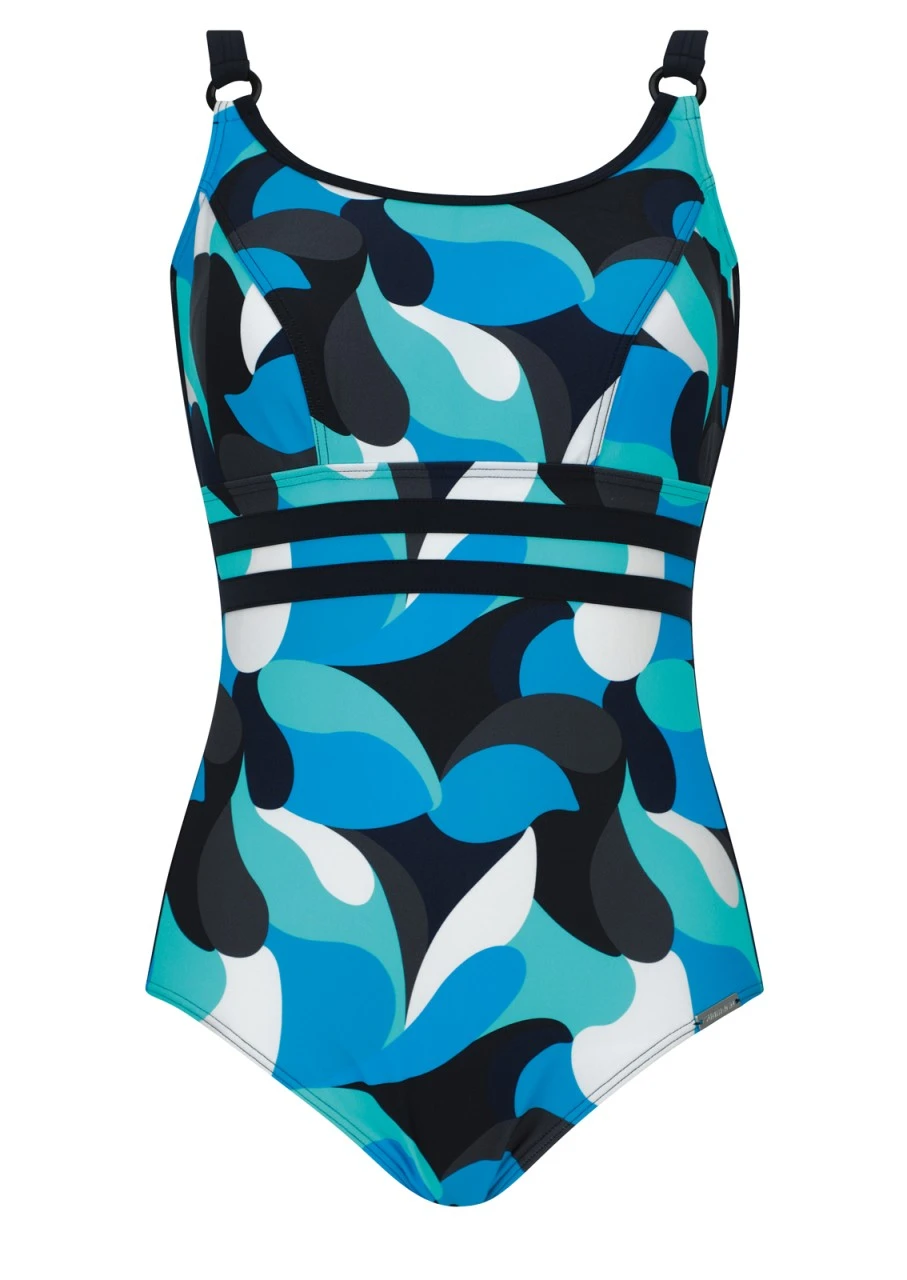 Frische und Sportlichkeit strahlt dieser Grafikprint in Blau, Weiß und Schwarz aus. Der Print macht Lust aufs erfrischende, kühle Nass. Mastectomy-Badeanzug mit Softschalen. Die eingearbeitete Halbcorsage rückt Ihre Figur mit optimal stützender und formender Funktion ins rechte Licht. Die Querstreifen in Gürteloptik lassen die Taille optisch schlanker wirken. Beidseitige Taschen ermöglichen das Einschieben der Prothesen und schützen sie vor Herausfallen. Das höher geschlossene Dekolleté sorgt für einen sicheren Sitz und der Brustansatz bleibt unsichtbar. Die Träger sind mit Zierringen geschmückt und können passgenau verstellt werden. Die Rückseite des Einteilers ist in der Farbe Nachtblau und hat einen tiefen Rückenausschnitt.