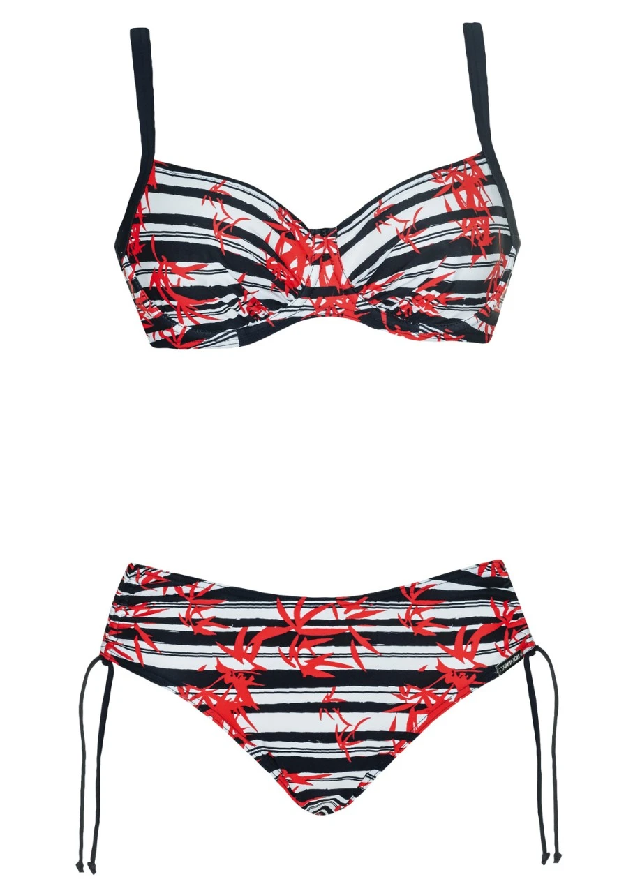 Das aufregende, nachtblau-weiße Streifenmuster mit knallroten Blüten ist ein echter Blickfang! Der Bügelbikini mit verstellbaren Trägern und Futterstütze sorgt für optimalen Halt. Der Bikini-Slip ist durch einen seitlichen Kordelzug in der Breite zu regulieren.