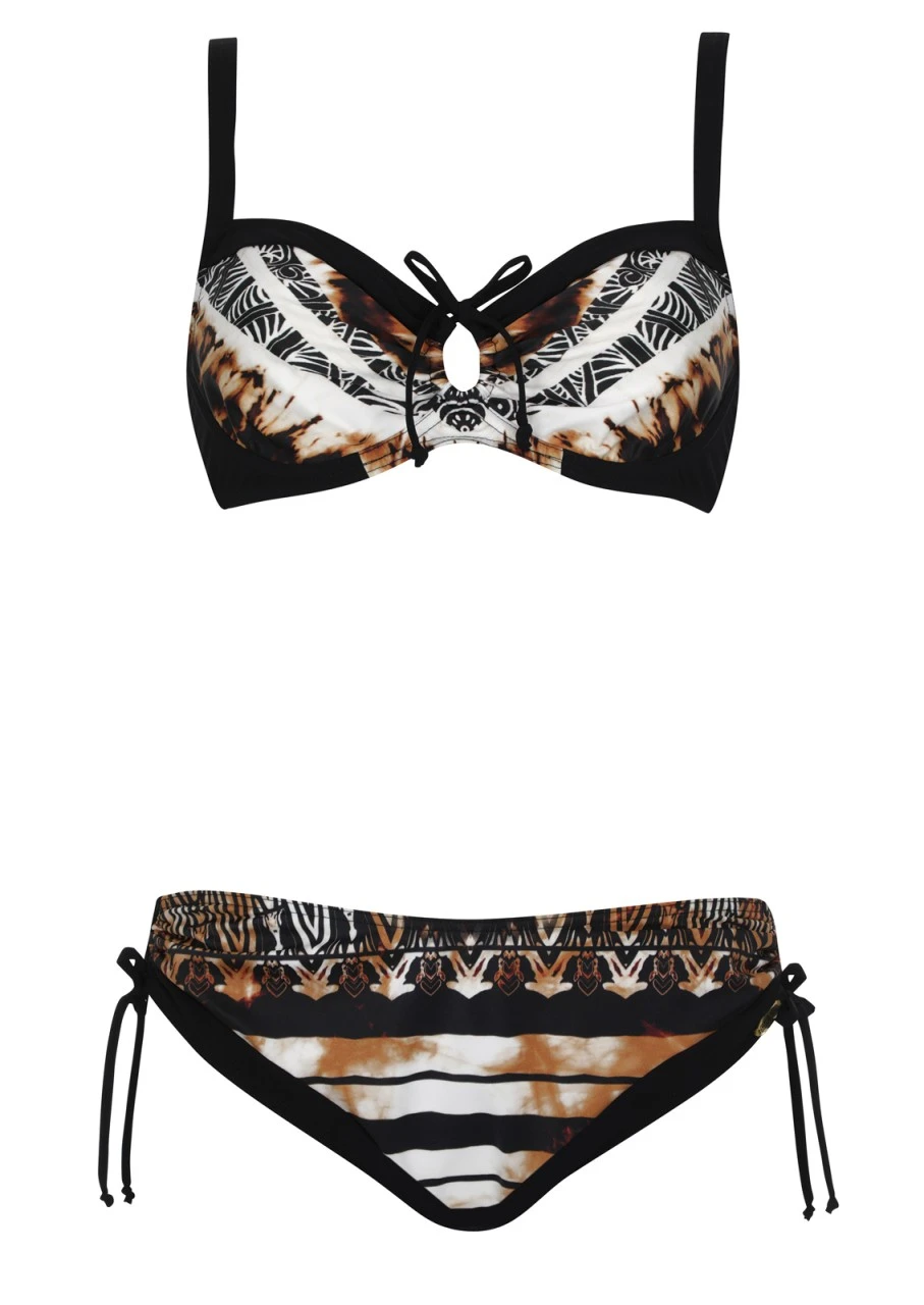 Frische Querstreifen kombiniert mit einem ornamentalen Print mit Ethno-Anklängen. Ein prachtvoller Grafikprint in warmen Brauntönen, Weiß und Schwarz. Bikini mit Formbügel und bequemer Futterstütze. Verführerischer Cut-Out zwischen den Cups, dieser wird mit Bändchen gehalten. Dadurch ist die Passform des Tops individuell einstellbar und ein perfekter Sitz garantiert. Die Träger sind verstellbar. Verstellbarer Slip – dank der seitlichen Bänder kann die Breite verstellt werden. Die Rückseite des Bikini-Sets ist in Uni Schwarz gehalten. Nachhaltige Bademode: Das Polyamid für den Oberstoff ist zu 100 % aus recycelten Fasern.