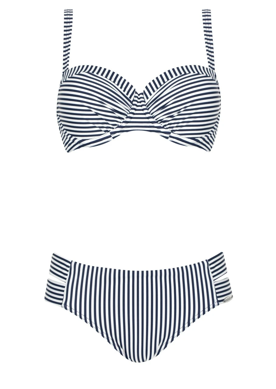 Schiff ahoi! Klassisches maritimes Design mit blau/weißen Streifen. Immer aktuell, immer schön! Bikini mit Softschalen und Formbügel. Die verstellbaren Träger sind am Rücken aushakbar, somit können die Träger auch im Nacken gebunden werden. Besonderer Eyecatcher ist der Bikinislip mit zwei Seitenbändern. Nachhaltige Bademode: Das Polyamid für den Oberstoff ist zu 100 % aus recycelten Fasern.