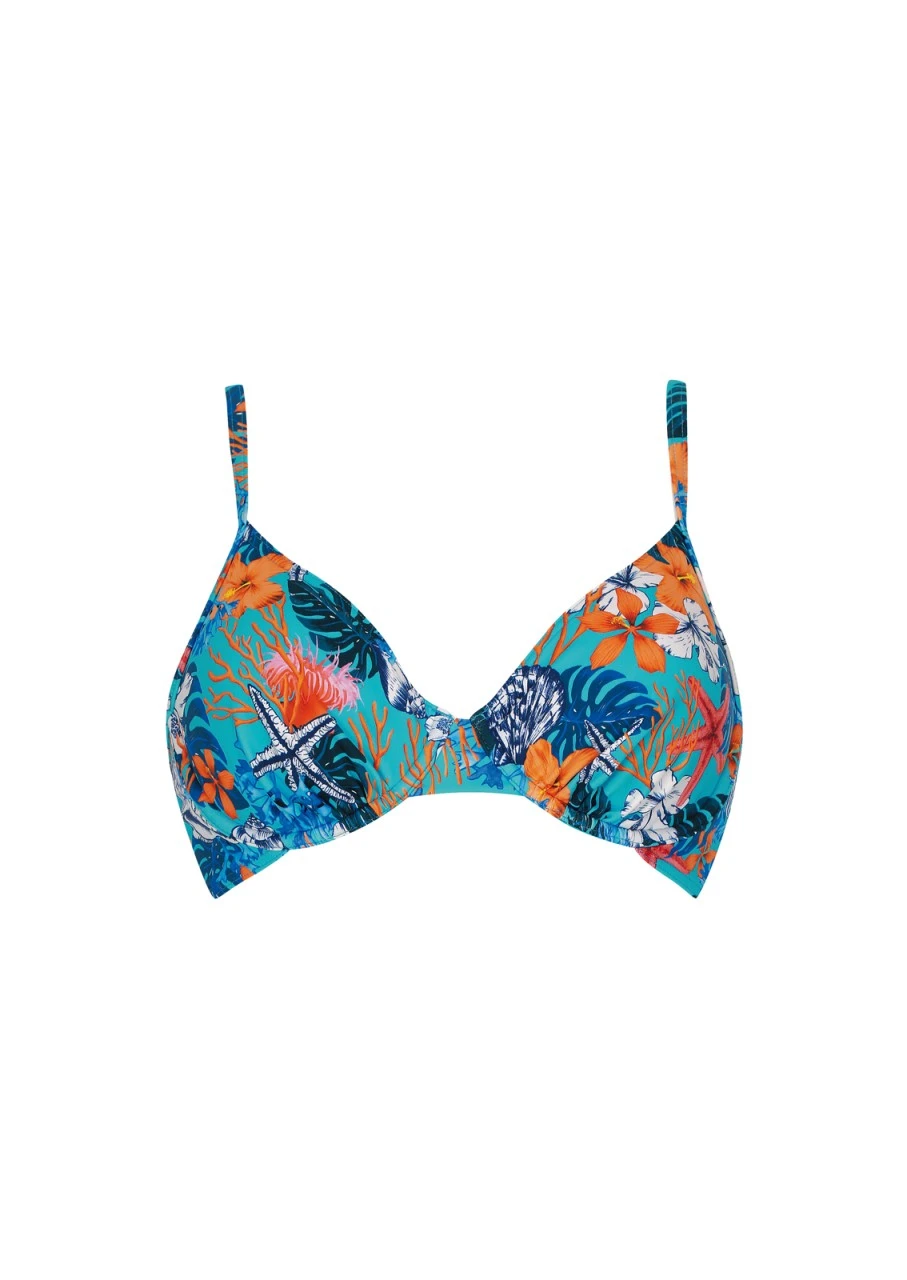 Unterwasserwelt trifft auf tropische Flora! Korallen, Seesterne, tropische Blätter und Hibiskusblüten eingefangen in einem spektakulären Druck in leuchtenden Farben. Der Print sorgt für Urlaubsstimmung und macht Lust auf die nächste Hitzewelle. Bikini-Top mit Formbügel. Die herausnehmbaren Softschalen entscheiden über mehr oder weniger Dekolleté. Die Träger sind verstellbar und am Rücken zum Aushaken, somit können die Träger auch im Nacken gebunden werden. Nachhaltige Bademode: OLYMPIA® GOES NEXT LEVEL – das Polyamid für den Oberstoff ist zu 100 % aus recycelten Fasern.