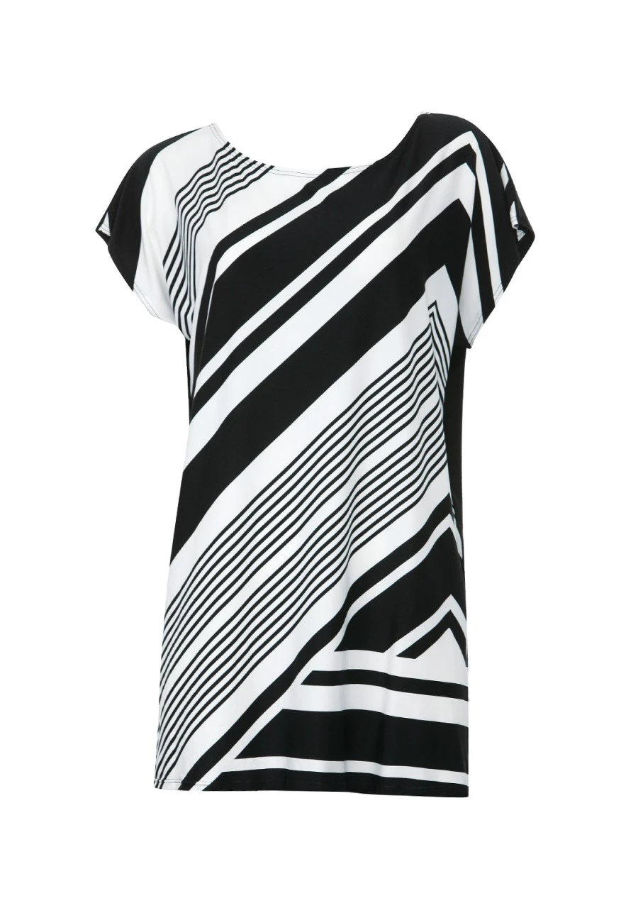 Lässiges Design in Schwarz/Weiß mit attraktiven Diagonalstreifen. Vervollständigen Sie Ihr Badeoutfit mit diesem bequemen T-Shirt-Kleid mit geradem Schnitt. Das Shirt in Mini-Länge, kurzen Armen und Rundhalsausschnitt ist ein tolles Cover-Up – perfekt für einen Badetag im Freibad, am Badesee oder Strand! Die Rückseite ist in Uni Schwarz gehalten.