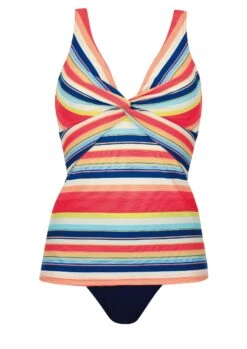 Zauberhafter Tankini in Schwarz mit Softschalen. Die Träger sind verstellbar und an der Rückseite zum Aushaken. Das Highlight ist die mittig angebrachte Flechtung in Regenbogenfarben, die dem Zweiteiler einen Frischekick verleiht. Taillienslip mit breiter Seitenhöhe.