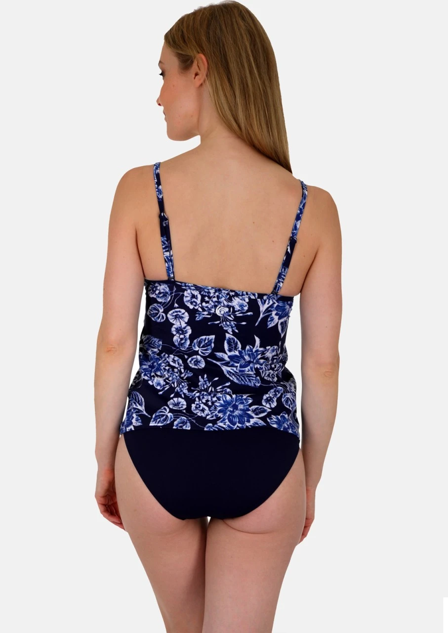 Blauer Hintergrund, darauf ein verspielter Blumen- und Blätterprint in Weiß/Blau. Ein leichtes und frisches Design. Tankini-Top mit herausnehmbaren Softschalen. Die Träger sind verstellbar und an der Rückseite zum Aushaken. Schöne Details: Niedliches, weißes Zierband am Dekolleté und unter der Brust sowie süße Zierbänder mit Pompons in der Farbe Weiß zwischen den Cups. Nachhaltige Bademode: OLYMPIA® GOES NEXT LEVEL – Bademode aus recyceltem Material.