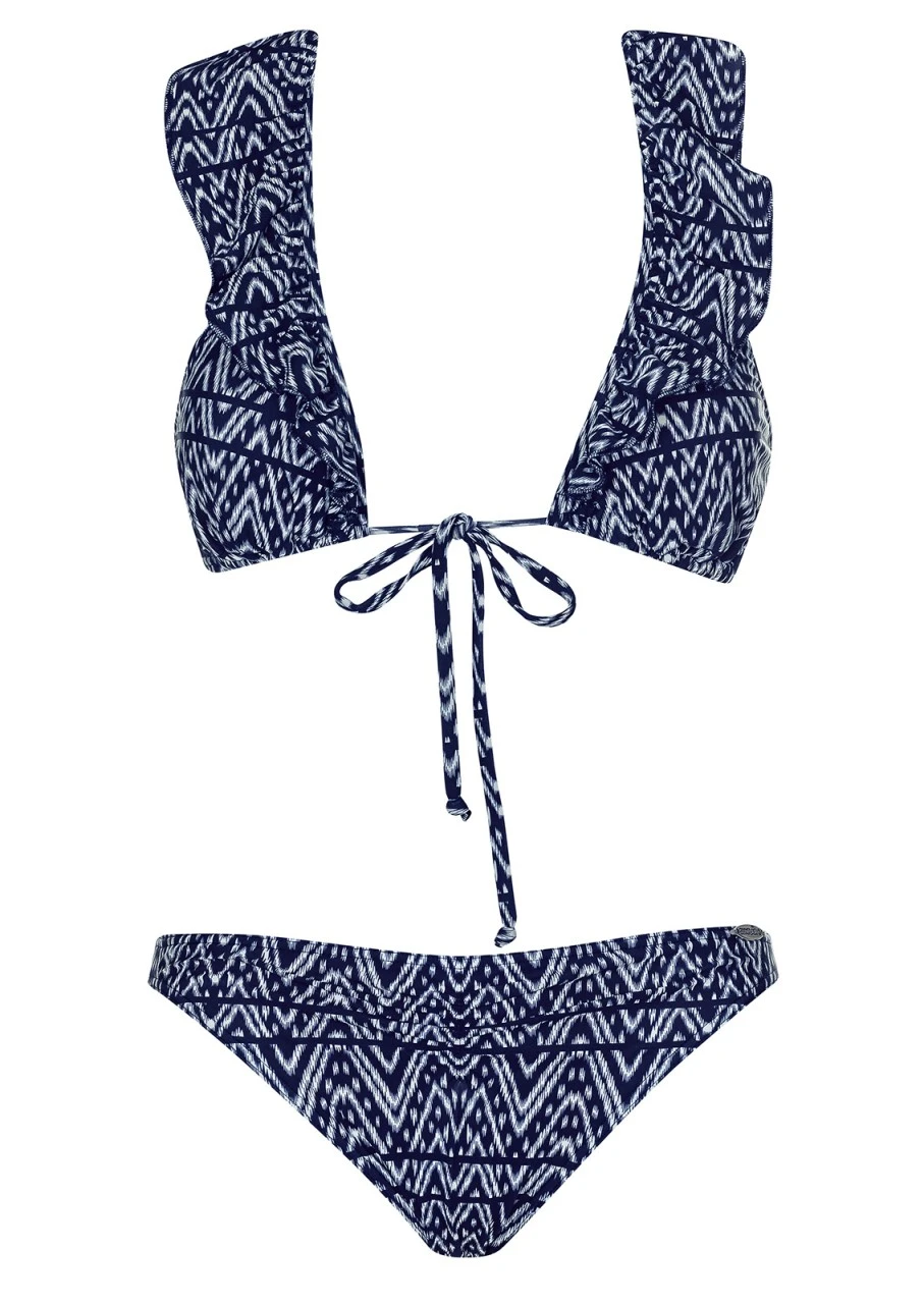 Batik goes Beach. Sehr süßes Design in Nachtblau mit weißem Zick-Zackmuster. Der Druck wirkt leicht verwaschen, dadurch entsteht eine Batik-Jeans-Optik. Bikini mit herausnehmbaren Softschalen, niedlichem Schleifenband im vorderen Bereich und süßen Rüschen am Dekolleté. Ein modisches Highlight!