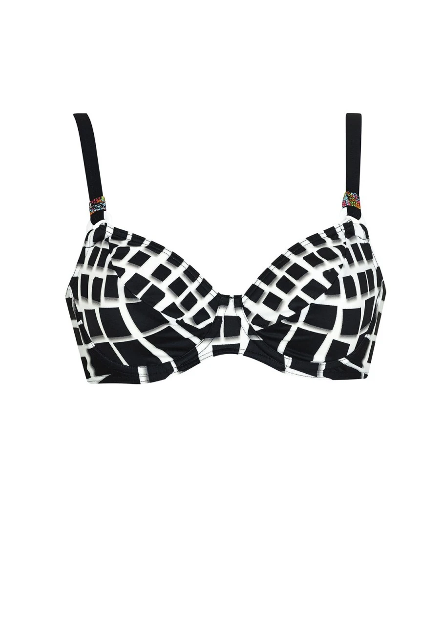 Ist es urban? Ist es ethno? Egal – vor allem ist es schön! Tolle Serie mit grafischem Print. Schwarze Rechtecke schweben fast über weißem Grund – unterbrochen von knallbunten Ornamenten im Inka Style. Ein echter Hingucker! Bikini Top mit Formbügel und verstellbaren Trägern.
