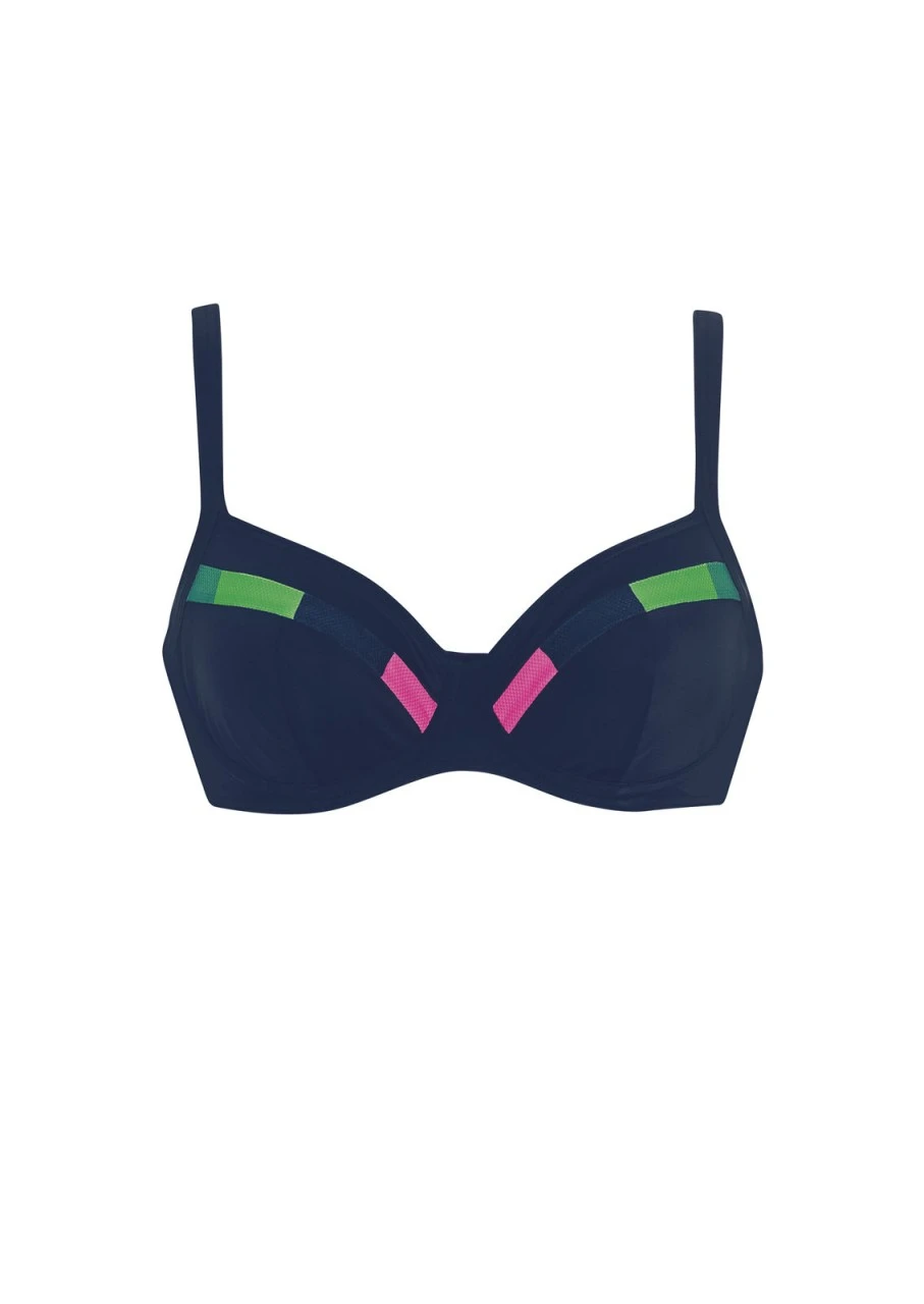 Blau, Grün, Pink. Als klare Farbfelder auf Uni-Grund. Bikini Top mit Formbügeln, Stützfutter und verstellbaren Trägern.